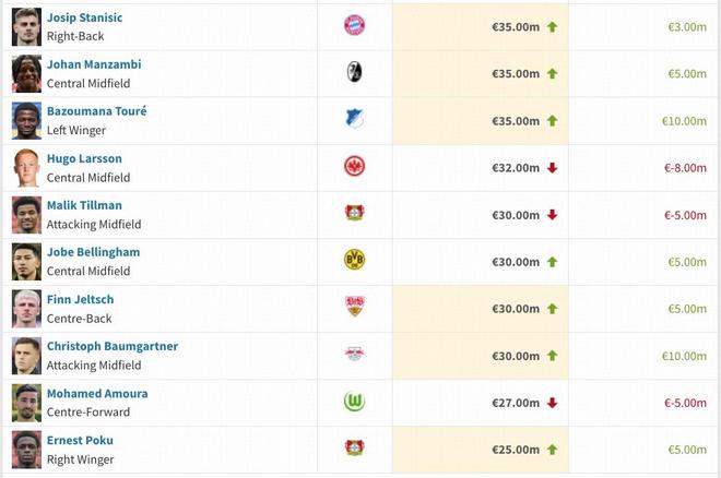 德甲部分球員身價(jià)變動(dòng)情況