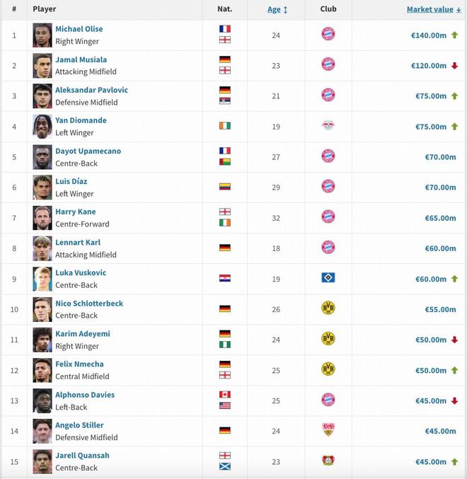 奧利塞以1.4億歐身價(jià)領(lǐng)跑德甲,穆西亞拉1.2億歐次之,帕夫洛維奇與揚(yáng)-迪奧曼德以7500萬(wàn)歐的身價(jià)并列第三。