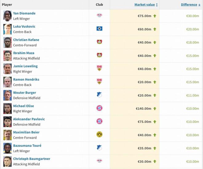 本期德甲有12名球員身價(jià)上漲超1000萬(wàn)歐,其中揚(yáng)-迪奧曼德上漲3000萬(wàn)歐最多,武什科維奇2000萬(wàn)歐,勒沃庫(kù)森隊(duì)科法內(nèi)上漲1800萬(wàn)歐,馬扎上漲1500萬(wàn)歐,斯圖加特隊(duì)萊韋林與亨德里克斯均上漲1500萬(wàn)歐。